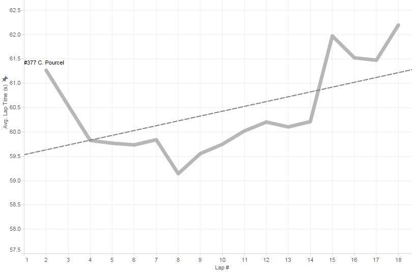 As for the riding in traffic issue, I think we see something for that, too. If you look at laps 2 & 3 for Pourcel, they are much higher than laps 4 through 14 where he seems to have a pretty consistent pace (albeit increasing slightly, as we would expect). If you compare that to the previous 3 riders we looked at, their laps 2 & 3 may be higher, but the dip is not nearly as pronounced:
