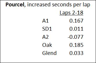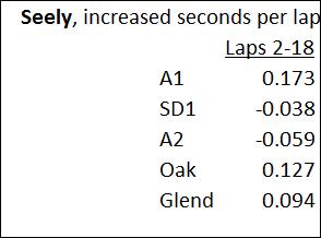 Seely's odd race is A2, where he had two laps at the beginning of the race that were much, much slower than the rest of his laps. If we remove that (again, not that we should), his average increase goes up to 0.084 -- so, it goes up some but not by a whole lot. There's a similar problem with SD1, though not as pronounced; if we remove that, his average goes up to 0.131, which is extremely high, but again is now relying on very limited data.