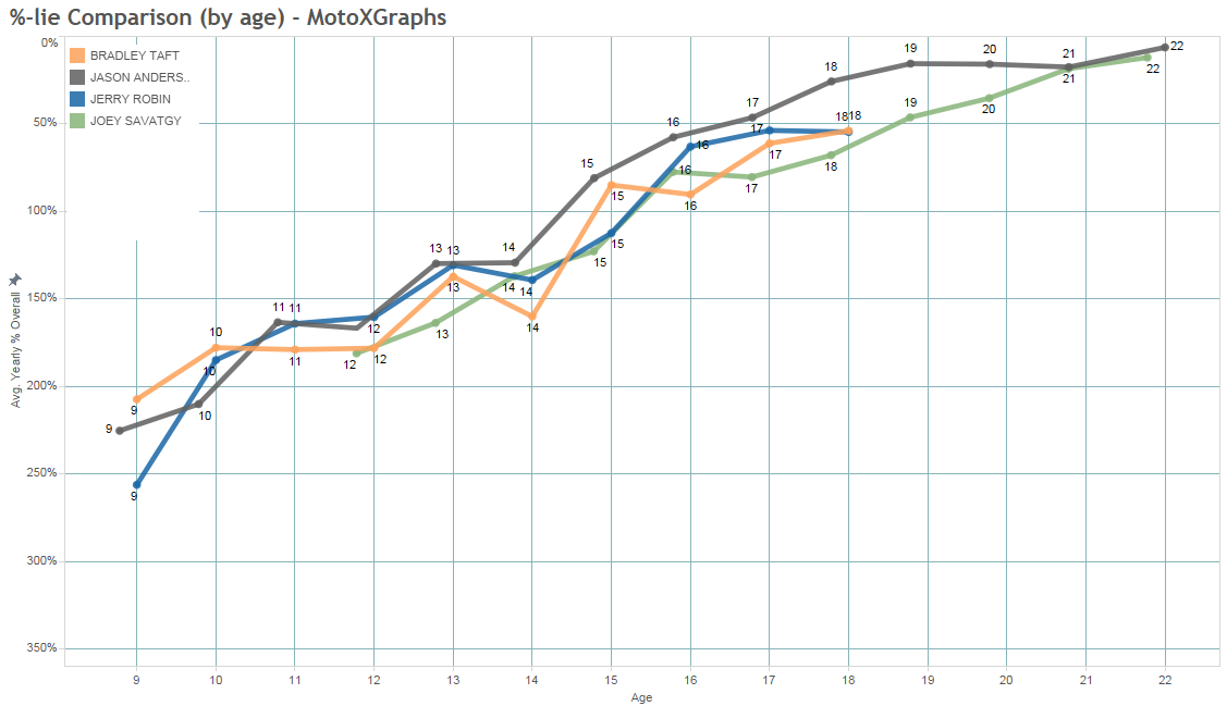 If I see an issue there, it's that his age-17 season was not that much better than his age-16 season, and his age-18 season was essentially at the same level as age 17. For reference, we can compare Robin with Taft, and let's include Joey Savatgy and Jason Anderson as some other relatively young pros from 250 and 450: