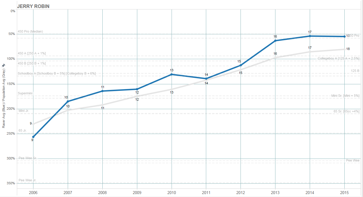 With his very good 250 results in Loretta qualifying and finals, Robin grades out as around the 10th best rider in the 250 amateurs this year. Nearly up to par with Taft (who was around 5th in 250 amaterus and thus in the top 1%), Robin would be in the top 2% of the class. From there, the prediction runs very similar to Taft's from the previous article -- except one big thing: Robin is riding in the upper 450 pro class, not the 250s.