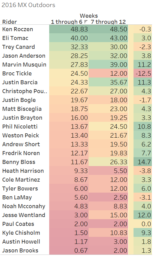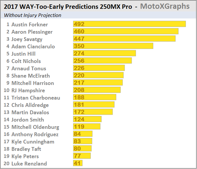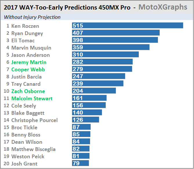 As for Malcolm Stewart, I was surprised he didn't have a slightly more favorable prediction. But without recent MX outdoor results, we don't have a ton to go on. By the time we do formal MX 2017 predictions, we'll have a season of 450 Supercross data to give us some idea of how well he'll transition to the bigger bike.