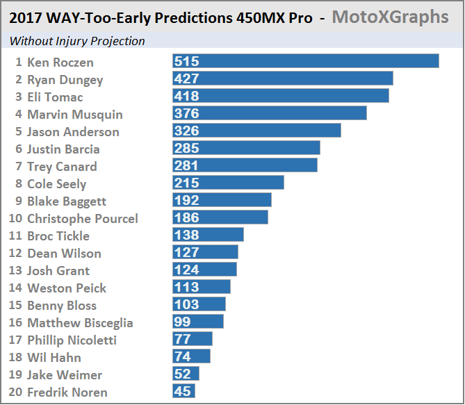 Marvin Musquin and Jason Anderson seem likely as #4 and #5, though who should be rated higher for 2017 is up for debate. Musquin gets the edge mostly because of good results in 2016 against an injury-riddled field. Correcting for "quality of competition" is something that we'll be looking into during this offseason, hopefully to be incorporated into the 2017 predictions.
