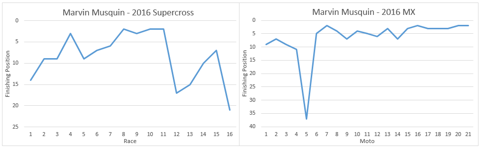 Musquin's average SX finish was around 8th; his average lap times for MX were around 5th.  But as you can see, he generally improved as the season when on -- assumedly as he adjusted to the bigger bike.  His early results from both 450 SX and MX bring down his average for the season.  If you focus on the latter portion of each season (for SX, right before his injury at Santa Clara in Week 12), he was in the Top 3 or 4 for both SX and MX: