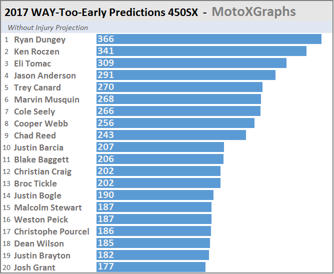 The #1 rider might be a surprise: Ryan Dungey.  Considering how Ken Roczen dominated the outdoor season, I would guess Roczen's the public's perceived favorite coming in to 2017 Supercross.  But what the numbers see is that Dungey was nearly as dominant in 2016 Supercross as Roczen was in Motocross.  And while MX numbers do play a part in the SX predictions, the numbers also see that Dungey wasn't that much slower than Roczen in 2016 MX for the few races they had together.  So Dungey is the #1 based on his past superiority in Supercross.